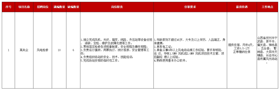 某央企單位因工作需要,由山西晉鑫仁和人力資源管理有限公司公開(kāi)招聘數(shù)名風(fēng)電檢修勞務(wù)外包工作人員,具體公告如下: